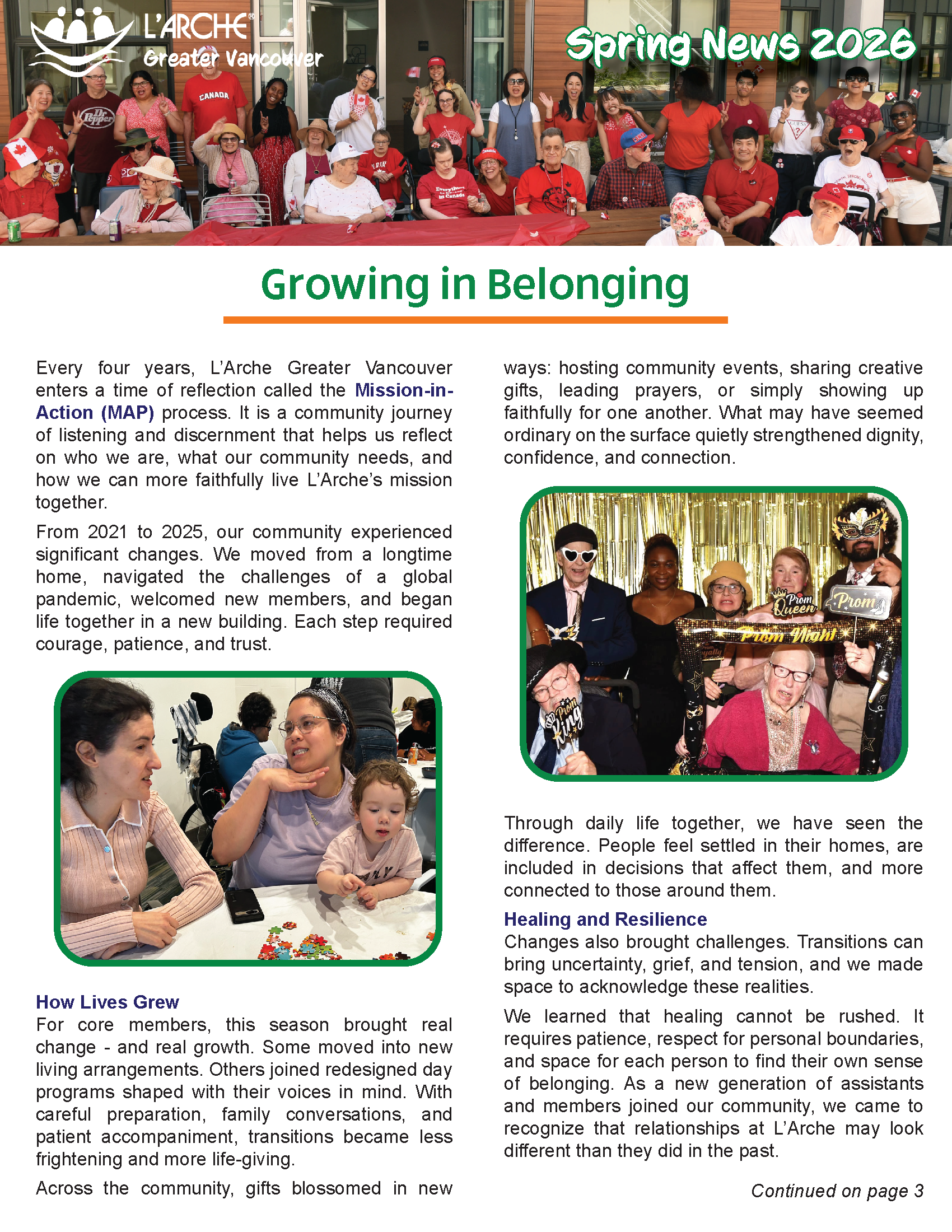 L’Arche Greater Vancouver generates up to three newsletters per year. Our newsletters include past highlights, upcoming events, profiles of people at L’Arche and general news about the community.